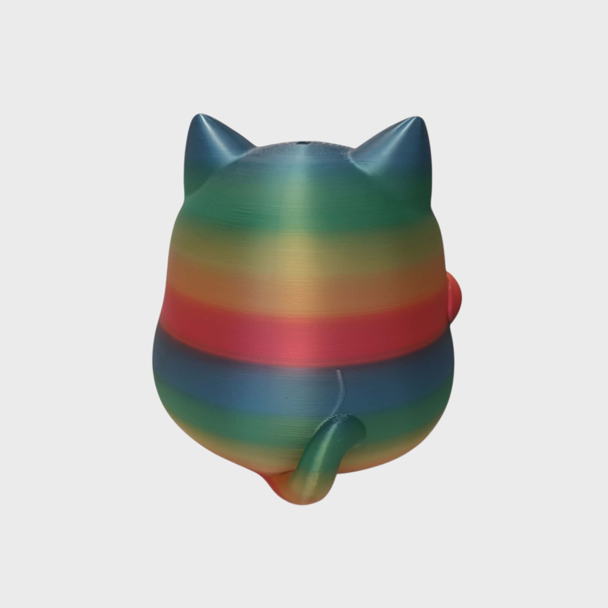 Ce petit chat se distingue par son design "gros yeux" signature, lui donnant une expression de curiosité et de douceur absolument craquante. Sa silhouette sphérique et trapue est entièrement parée d'un dégradé arc-en-ciel (bleu, vert, jaune, rouge) qui capte magnifiquement la lumière. Les détails colorés accentuent son charme : de petites joues rouges, un museau et des coussinets de pattes roses, et de moustaches noires bien dessinées.