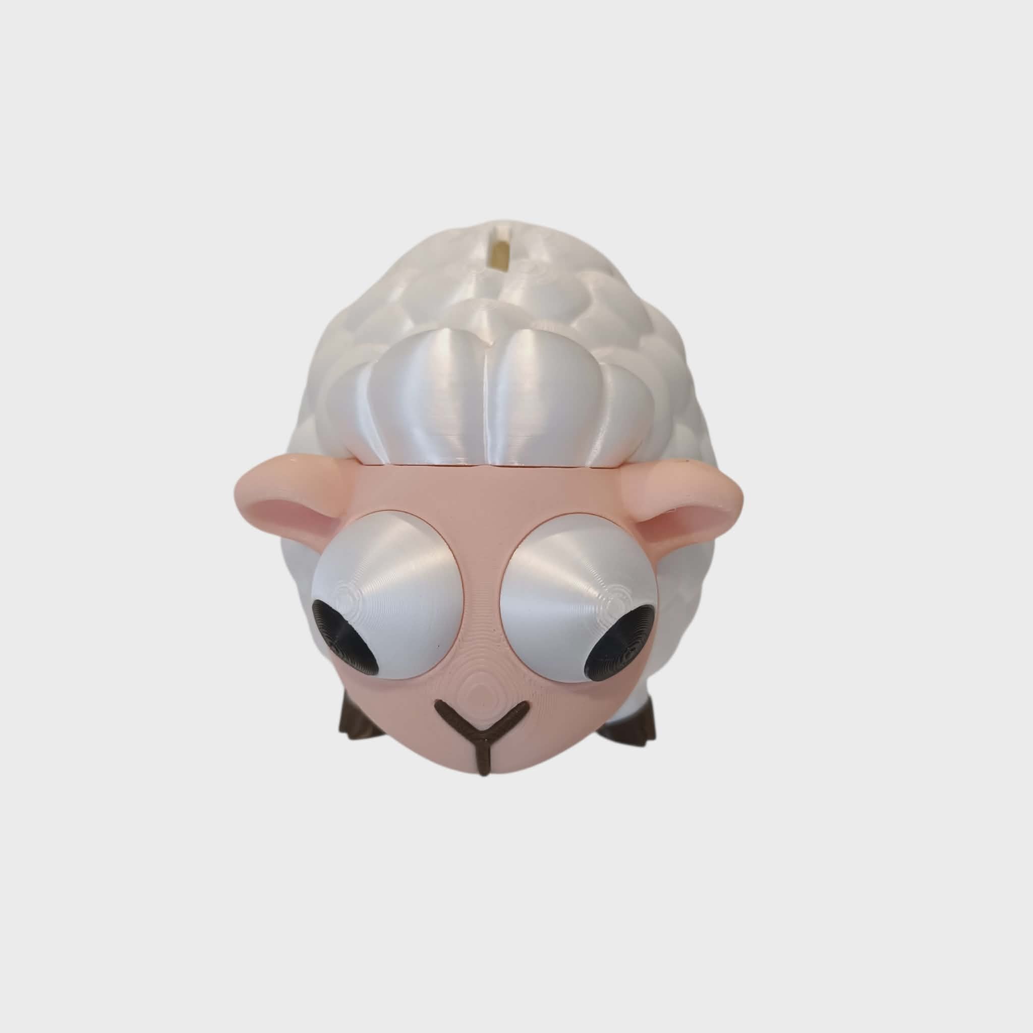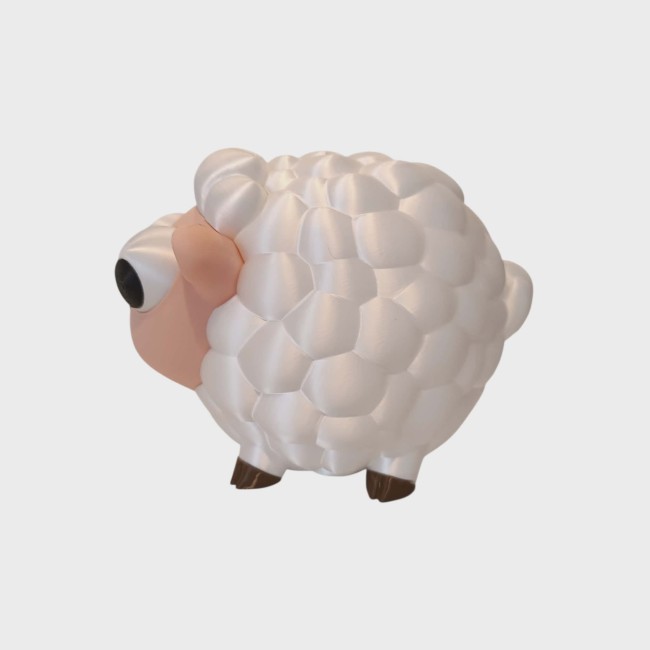 Ce petit mouton se distingue par son design "gros yeux" signature, lui donnant une expression de curiosité et de douceur absolument irrésistible. Sa silhouette sphérique et trapue est entièrement parée d'une laine blanche brillante stylisée en motifs géométriques, captant magnifiquement la lumière. Sa tête rose poudré abrite d'immenses yeux ronds, un petit museau brun et de petites oreilles, contrastant avec ses pattes brunes.